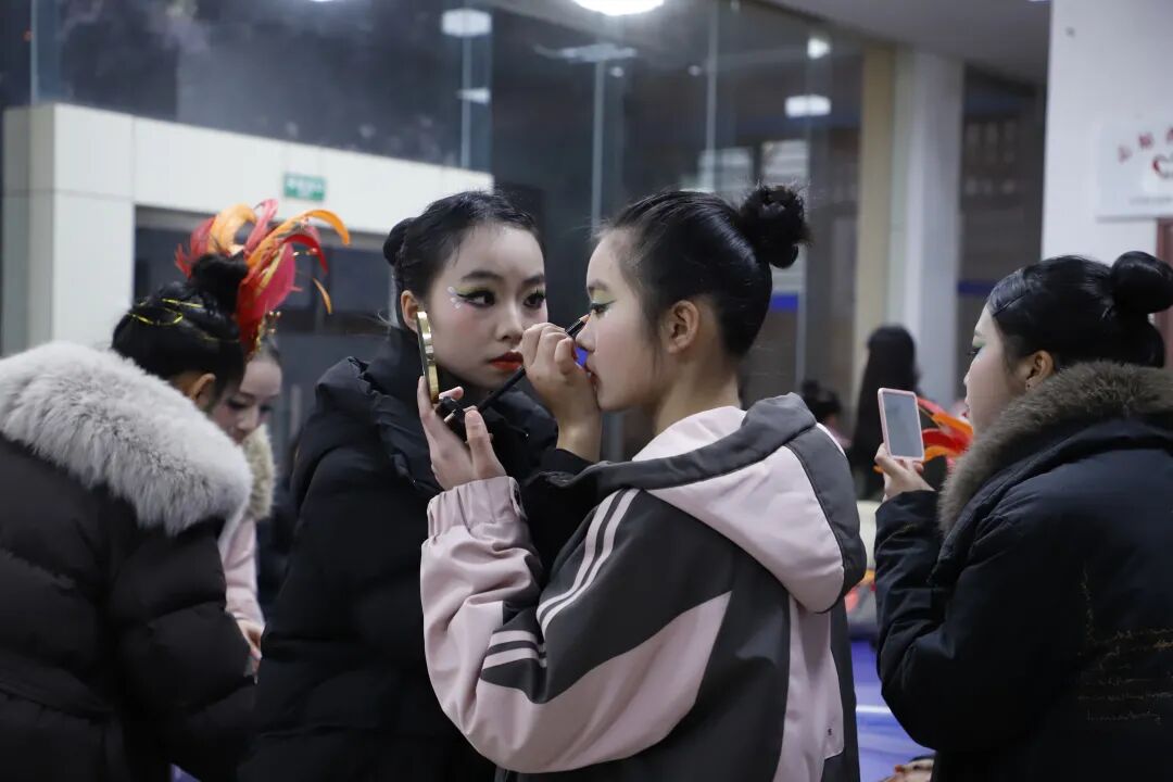 后台化妆区,化妆师们伏在演员身前,眉笔在眉骨上细细勾勒,粉扑在脸颊上轻轻拍匀。素净的脸庞一点点染上舞台的光彩。