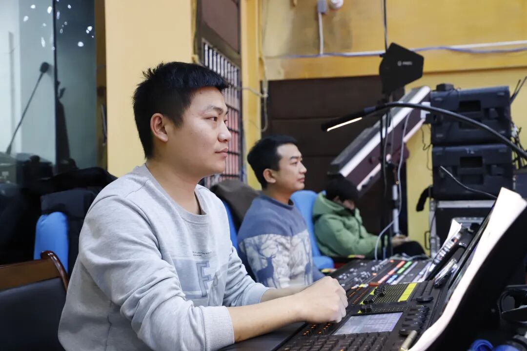 后台操控区内,导演手持对讲机低声调度,音响师指尖在调音台上快速校准每一轨声部,灯光师推杆起落间,绯红与湛蓝交替铺满裙摆。他们隐在暗处,目光却始终追着舞台——这里没有一秒钟可以走神。