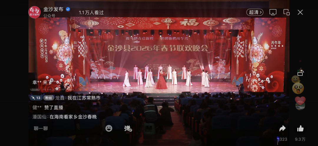 歌声渐歇,会堂顶灯次第亮起。观众迟迟不愿散去,有人低声复盘精彩瞬间,有人举着手机定格温暖。直播间里,温情同样在刷屏:超14万人次在线云相聚,点赞量突破13万。未能归乡的游子,在评论区一字一顿敲下心底的眷恋:“身在他乡,心系金沙”“祝家乡越来越好”。这一句句朴素的告白,跨越万水千山,化作最柔软的乡愁,飘向乌蒙深处的故土。