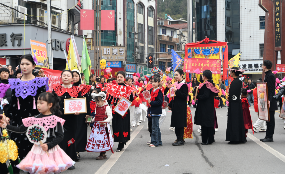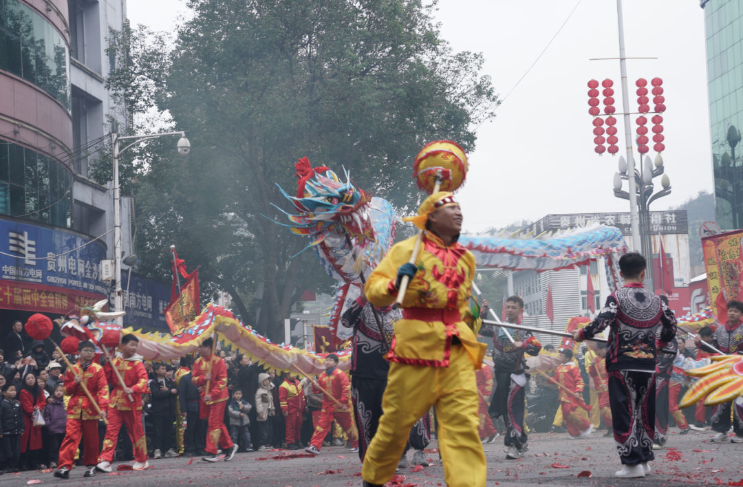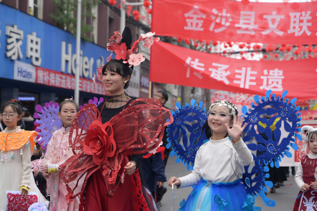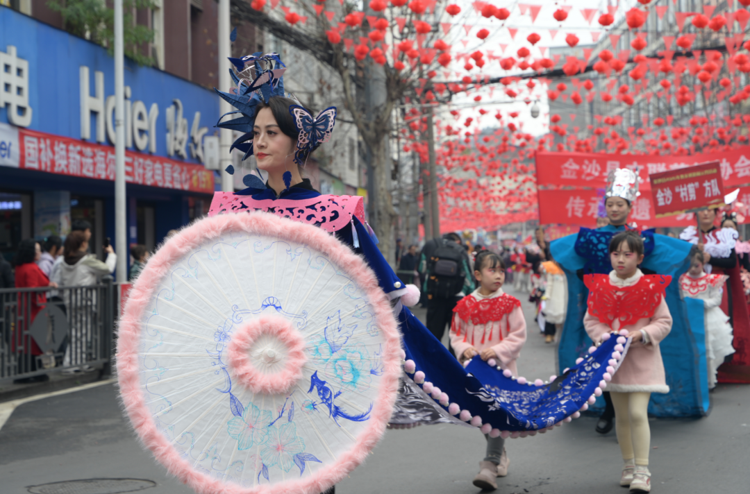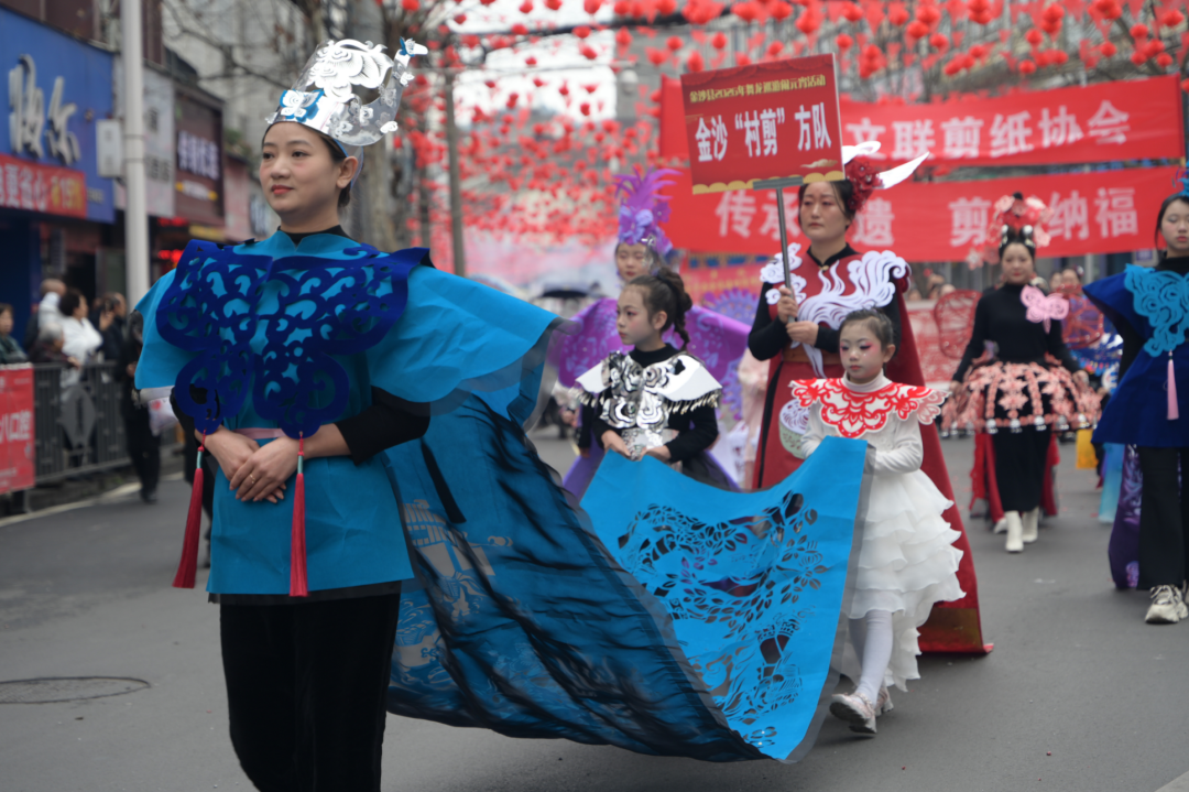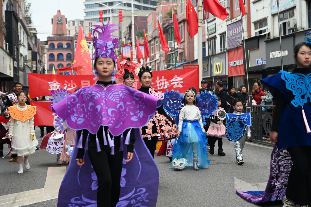 礼成之后,群龙齐舞,将现场热烈气氛推向顶峰。11时30分,新春民俗大巡游正式启程。由近二十个特色方阵组成的巡游队伍,从鼓韵广场浩荡出发,沿河滨路、长安街等主要干道行进,所到之处万人空巷,欢呼不断。巡游队伍阵容强大,亮点纷呈:主花车领航,喜庆乐曲相伴;舞龙方阵翻腾跃动,气势如虹;民族服饰方阵绚丽多彩,展现多民族团结画卷;独具匠心的剪纸服饰方阵,将传统非遗与现代时尚完美融合;此外,非遗展示、腰鼓、企业风采、亲子家庭、活力健身、管乐演奏等方阵依次亮相,全方位展现金沙的历史文脉、民俗风情、城市活力与时代风貌。