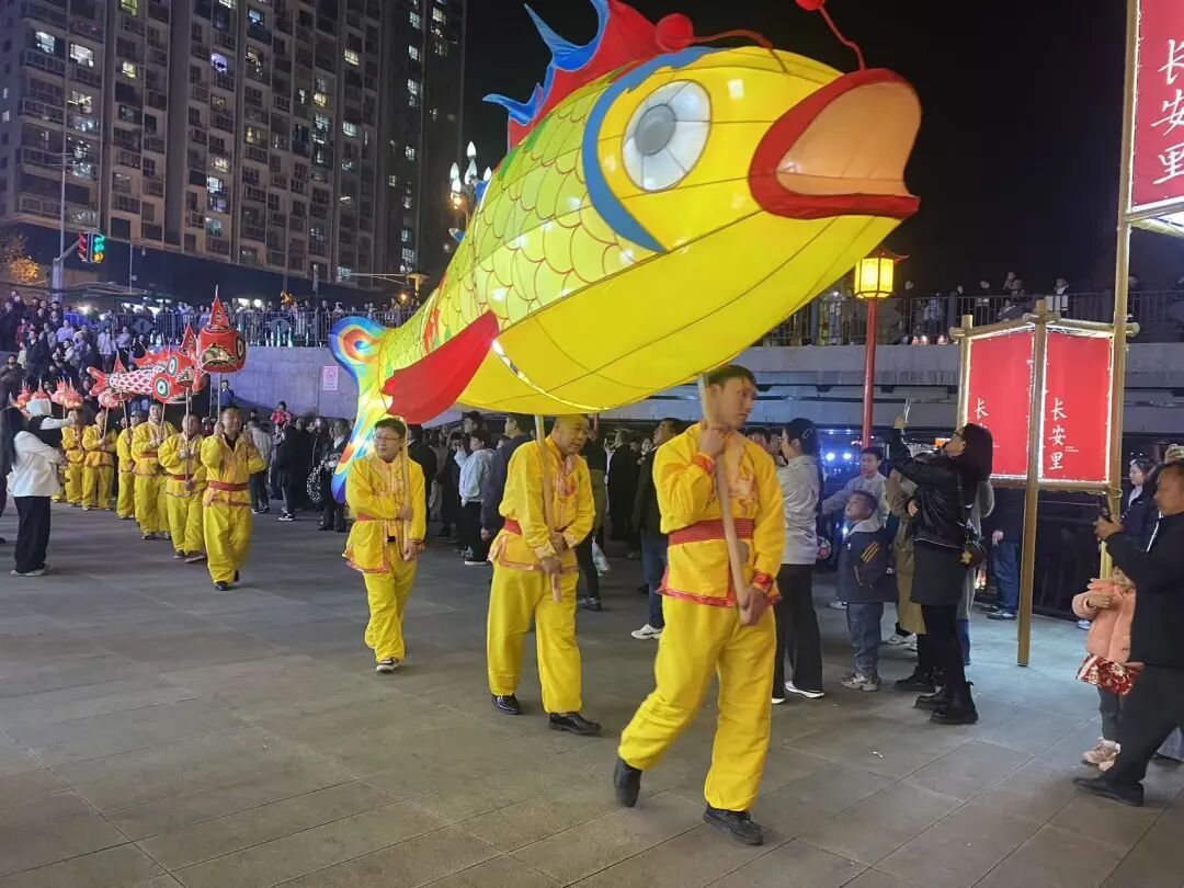 随着夜幕降临,活动进入高潮。晚上八点,绚烂的烟花在夜空绽放,一条金色长龙在锣鼓声中昂首“破雾”而出,数十盏五彩鱼灯紧随其后,沿街巡游。鱼灯巡游巧妙融入了快闪、舞蹈、音乐及灯光秀等现代形式,灵动的鱼灯在人群中穿梭,灯影流转宛如流动的星河,带来强烈的视觉冲击与沉浸式体验,传递着“年年有余”的美好寓意。巡游队伍所到之处,喝彩声、欢笑声此起彼伏。