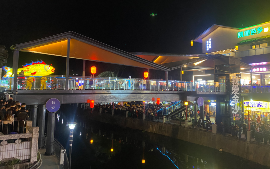 桥上,身着传统服饰的舞者翩翩起舞;桥下,舞龙队伍翻腾跳跃,鱼灯缓缓游动,上下呼应,场面生动热闹。“我觉得这次新年的表演特别新颖,和以前的舞台表演不一样。桥上有表演,桥下有玩龙的、鱼灯之类的,过年的味道特别浓。”市民王聪一边用手机记录精彩瞬间,一边称赞道。